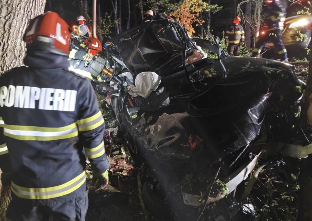 Mașina a părăsit partea carosabilă, a lovit un arbore de mari dimensiuni și s-a răsturnat pe plafon în urma impactului extrem de puternic.